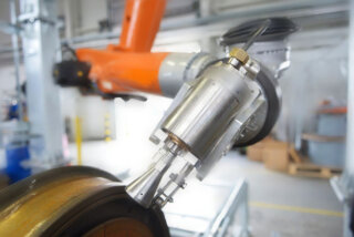 Die anwendungsflexible Hoch-Druck-Wasser-Strahl-Technologie ermöglicht eine materialschonende nichtabrasive Reinigung oder Entlackung von Radsätzen, Drehgestellen und Fahrzeugkomponenten mit Hilfe eines Robotereinsatzes. Die robotergeführten Wasserdüsen werden an den Konturen des Radsatzes mit einem rotierenden Wasserstrahl und einem Druck von bis zu 2.500 bar entlang bewegt und erreichen somit die vollständige Oberfläche des Radsatzes, ohne die Radsatzoberfläche in ihrer Struktur zu verändern. Weitere Nachbearbeitungen entfallen.