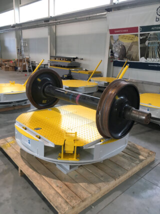 Der Hubdrehtisch wird dafür verwendet, um den Radsatz auf eine ergonomische Arbeitshöhe für die Montage von Lagern oder andere Arbeiten zu heben und anschließend die Drehrichtung hinsichtlich des Weitertransportes zu ändern.